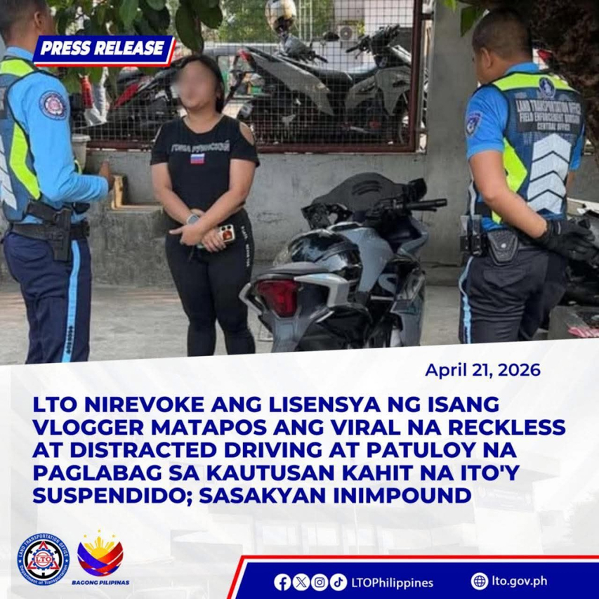 She now faces the revocation of her driver’s license and will be disqualified from reapplying for two years. On top of that, she must settle fines for reckless driving, the Anti-Distracted Driving Act (RA 10913), and operating a vehicle without a valid license.